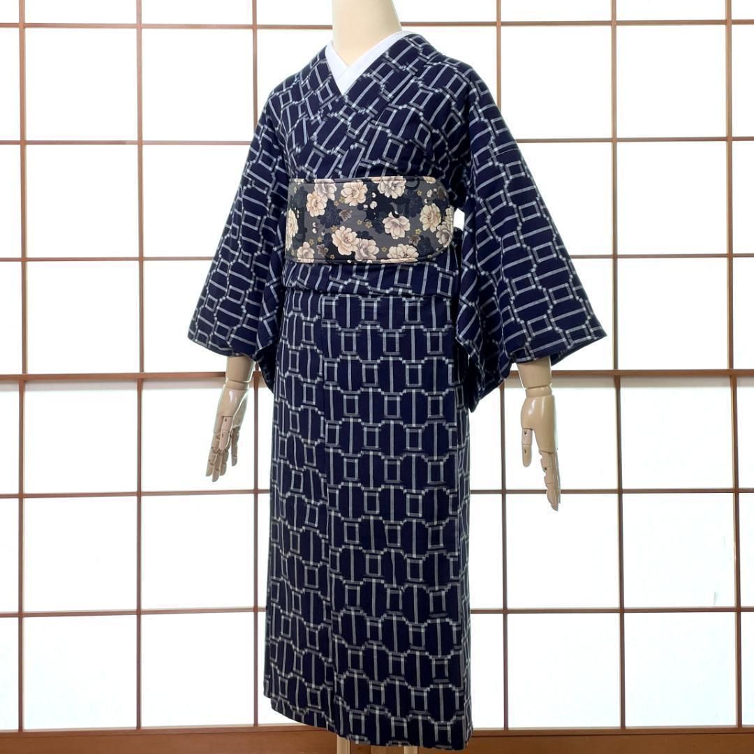 久留米絣 単衣着物 綿 幾何学柄 濃紺 ビンテージ着物 リユース品 A-2475