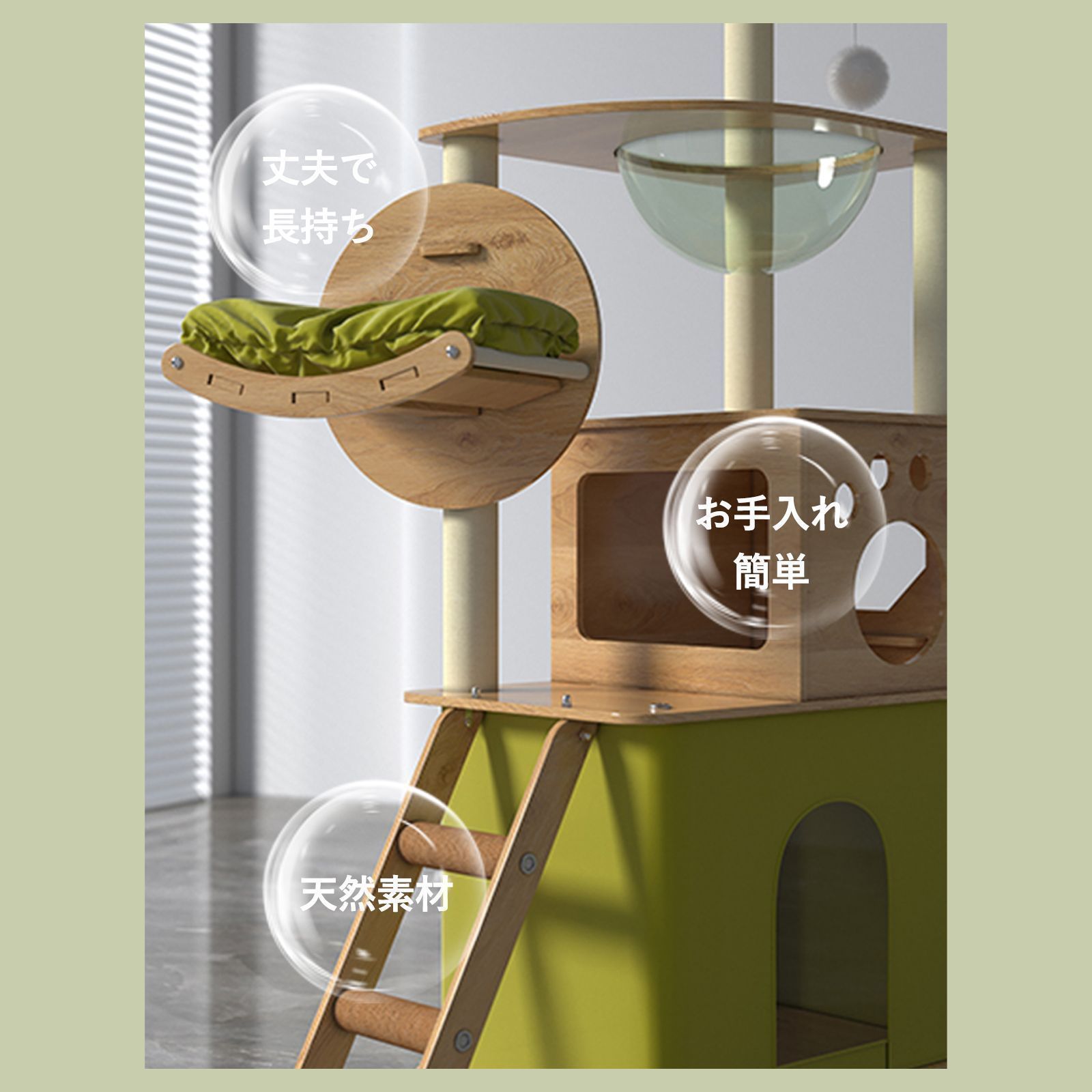 【段取りのいい台座・広々とした快適な空間】快適な猫ハウス、展望台、透明な宇宙船のハンモックがあります。猫の運働量と休憩時間が増え、健康で楽しく成長できます。支柱にはたっぷりの麻ひもが巻かれているので、猫たちは思う存分爪を研いで引っ掻くことができます!愛猫が簡単に高所まで登れるのために設計され、段取りのいい高さで子猫ちゃんもシニア猫も快適に遊べます。多頭飼いでも喧嘩せずにゆっくり休めます。