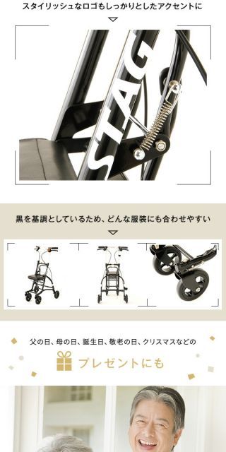 【スタッグ】は黒を基調としたフレームで構成されているのでシルバーカーにあまり馴染みが無い男性にも抵抗無くお使い頂けます。又、着ている服装にも合わせやすいので女性にも人気があります。押し手の高さが96.5cmまで設定できるので背の高い方でも負担なく御使用頂けます。グリップから手を離さずにボタンを押すだけのワンタッチ駐車ストッパーで安心。レバーを下に下ろすだけで簡単折りたたみ、組立もレバーを上げるだけの簡単操作。