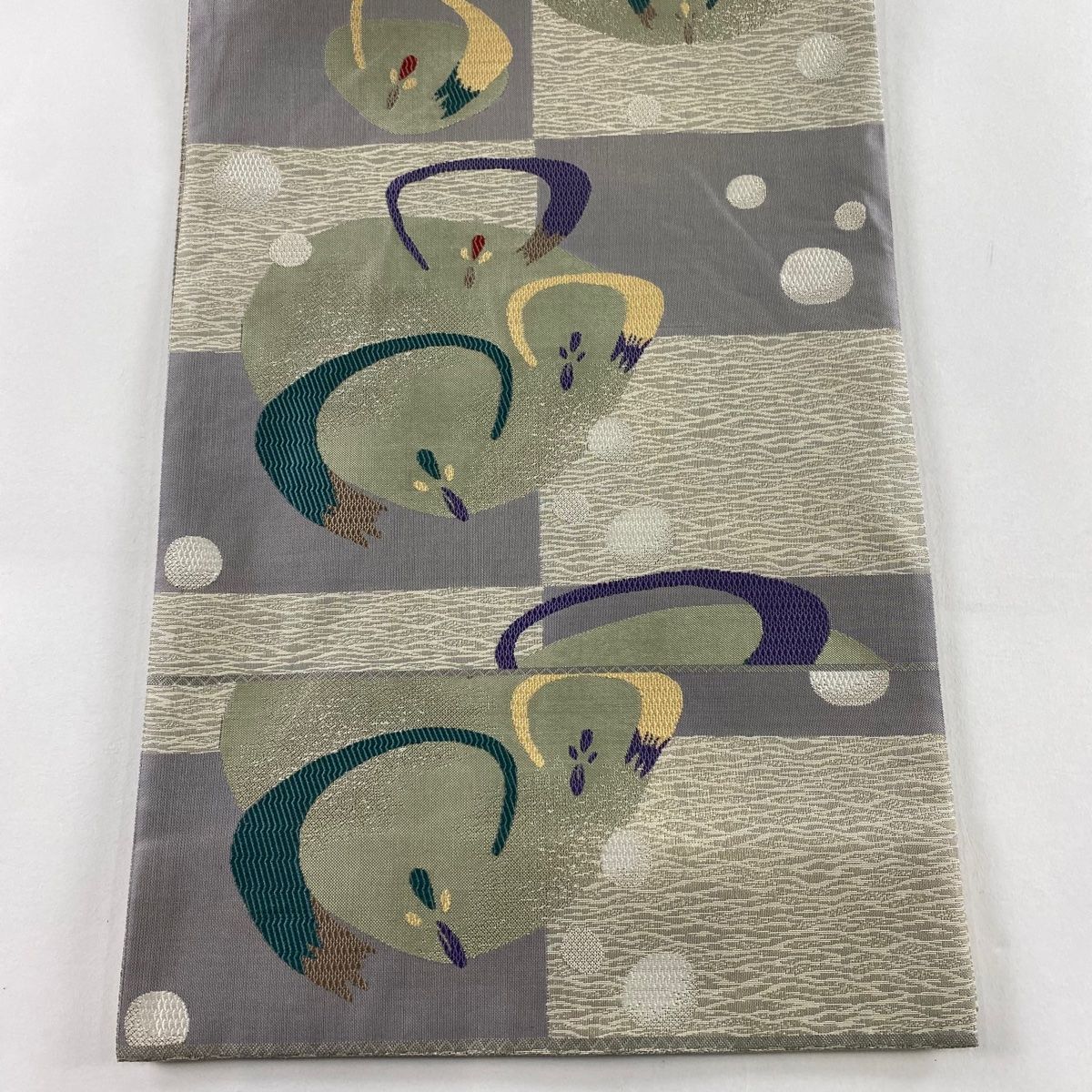 袋帯 秀品 変わり市松 幾何学模様 箔 灰緑 六通 正絹