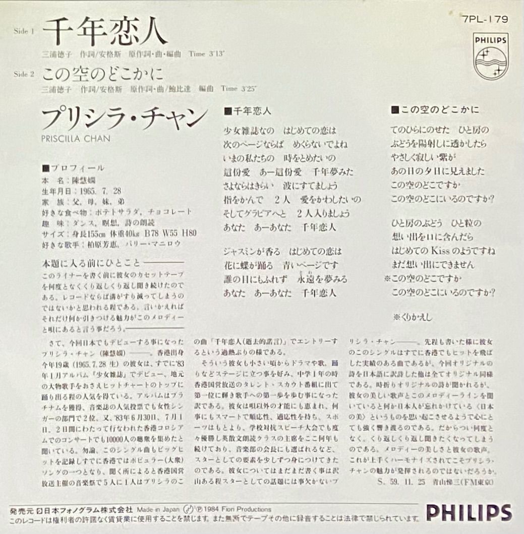 『千年恋人/この空のどこかに』 EP 7PL-179