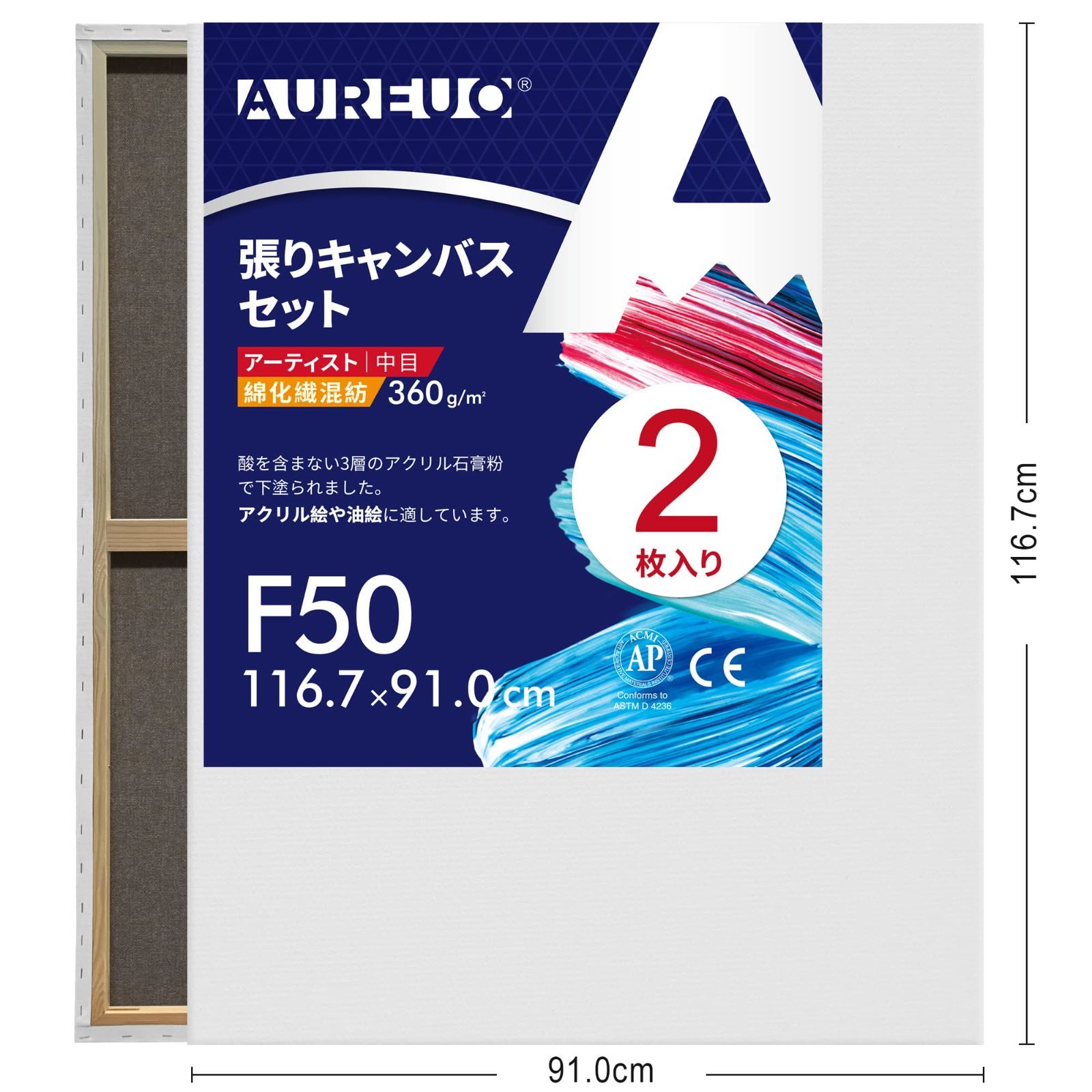 AUREUO 張りキャンバス セット F50 (116.7cmX91cm) 中目 綿化繊混紡 2枚 初心者 絵画用具 芸術絵創作 現代油絵 美術装飾 水彩画・油絵画・アクリル兼用