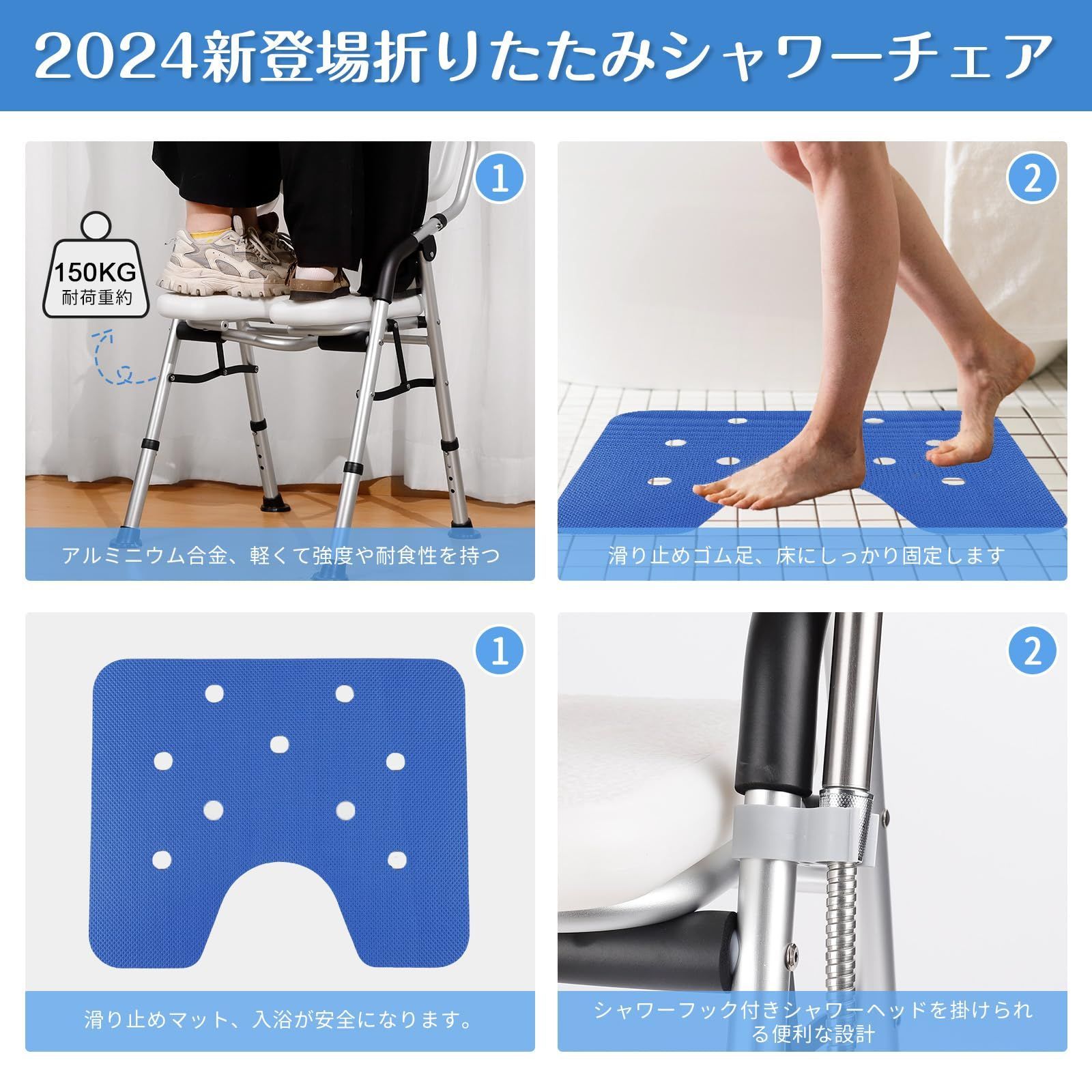 折りたたみ シャワーチェア U型溝座面 高さ4段階調節 耐荷重150 kg アルミ合金製 介護 軽量 丈夫 介護チェア お風呂椅子 転倒防止 入浴用品 収納に便利 DEWEL 組み立て簡単 日本語説明書付き U型座面