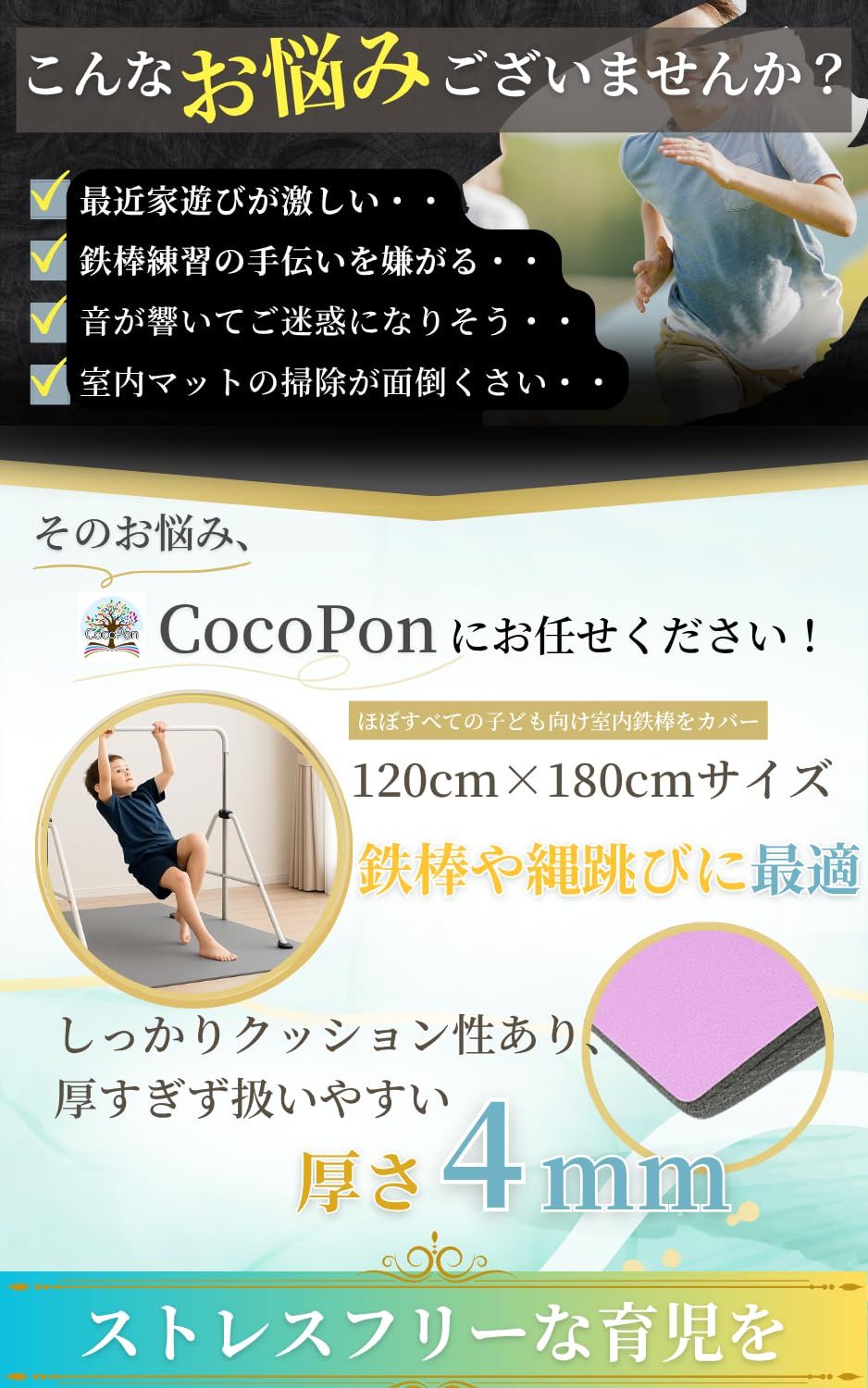 子どもの室内鉄棒やトランポリンがぐらついたりフローリングに跡が付いたりしていませんか? CocoPonの鉄棒マットは、厚さ4