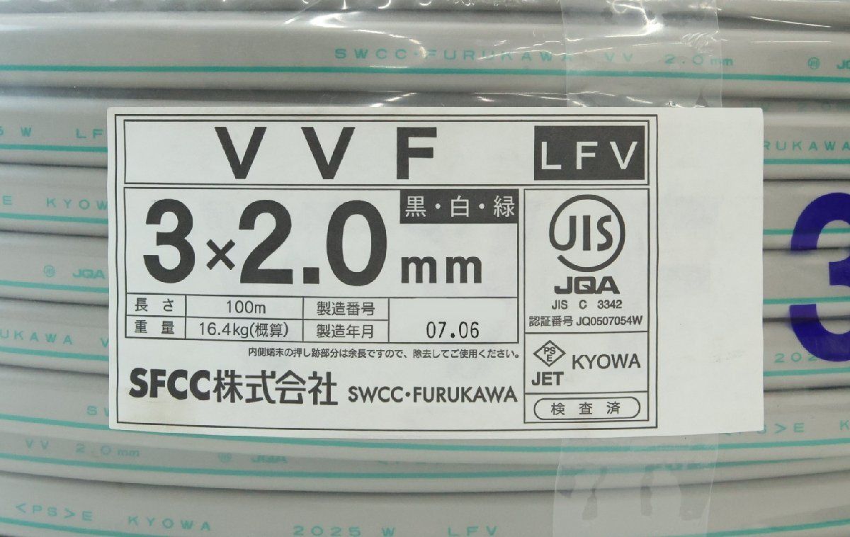 【 商 品 名 】 SFCC VVFケーブル 3×2.0mm 100M 黒白緑