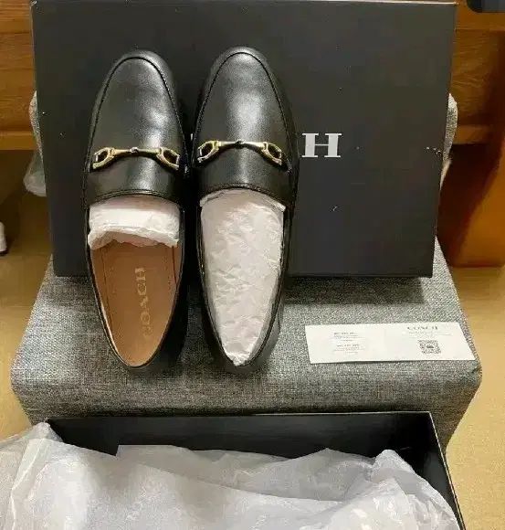 コーチレディースローファー5.5(225〜230mm)は新品です。ブラックカラーとゴールドの装飾が高級感を醸し出しています。