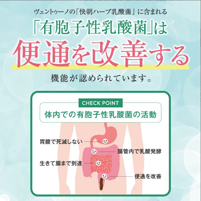 快朝シリーズから、便通を改善する機能がある有胞子性乳酸菌(Bacillus coagulans SANK70258)を配合した機能性表示食品のサプリメントです。有胞子乳酸菌は熱や胃液などに含まれる酸に強いため、一般的な乳酸菌が死滅するのに対し、生きたまま腸まで到達することができます。さらに健康をサポートするハーブ成分や約80種類の植物性発酵物など、からだにやさしい成分が含まれています。