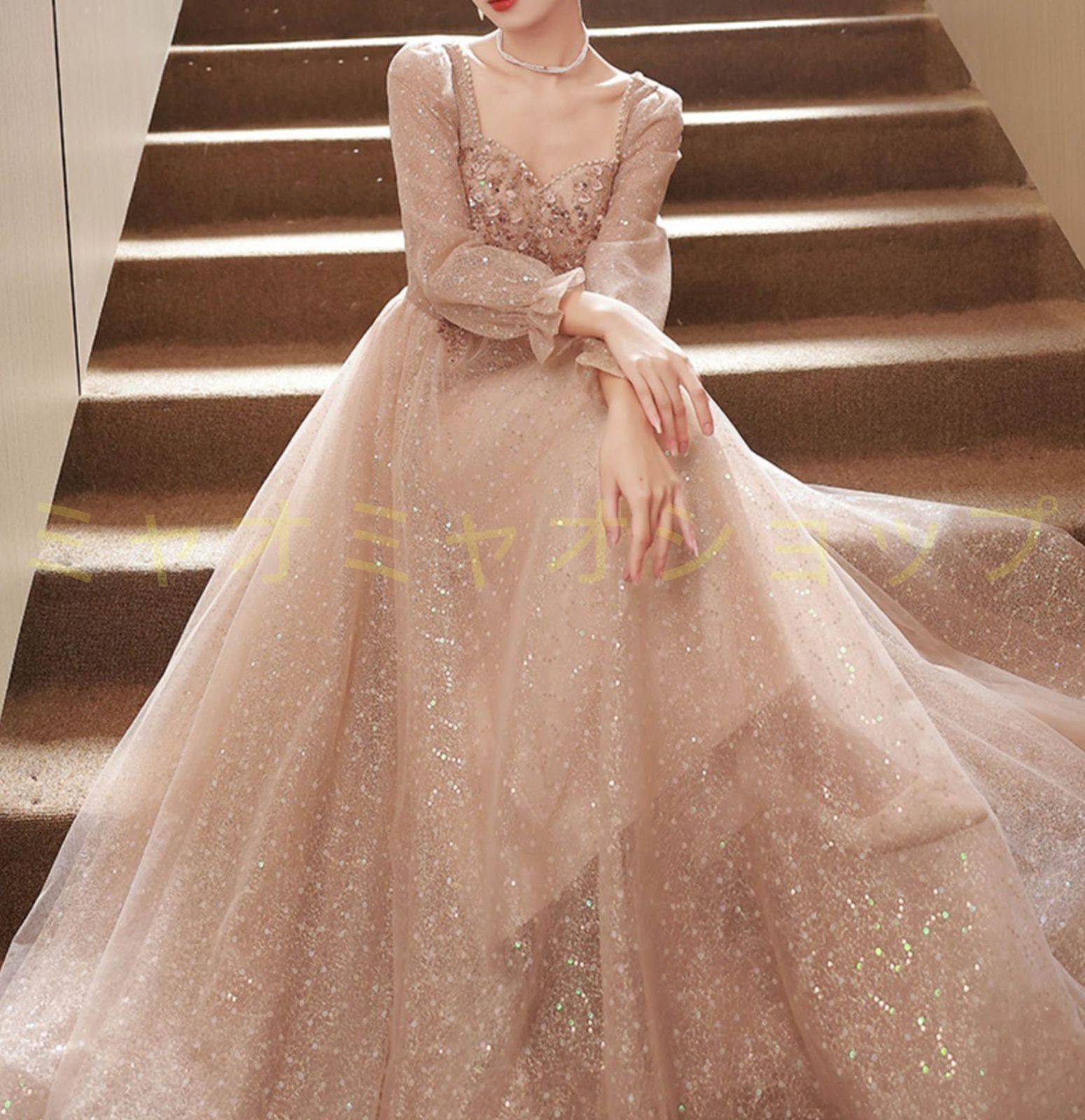 シャンパンカラーのカラードレスで、特別な瞬間を華やかに演出しませんか~この美しいロングドレスは、パーティーや発表会、演奏会にぴったり。控えめながらも目を引くデザインが魅力です。長袖で、エlegantな印象を与えつつ、着心地も快適です。