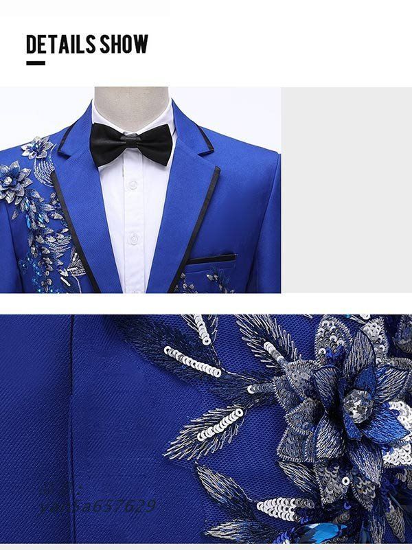 タキシード きらきら メンズ スーツ ジャケット 長ズボン 上下セット 2点セットアップ 演出服 ステージ衣装 光沢のあるジャケット スパンコール 衣装 黒白 2色選べるズボン 白 紺 紫 赤 青 スパンコール クリスマス仮装 ハロウィン衣装 X1X0