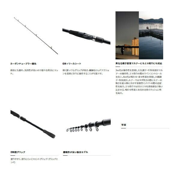 軽量なフカセウキの投入がしやすく、ロッド全体のしなやかさが最大の特徴。波止・磯でのグレ・チヌを狙ったフカセ釣りはもちろん、繊細なティップにより胴付き仕掛けでのカワハギ釣りや口切れが多発しやすいサビキ釣りでのアジ釣り等にも活躍します。