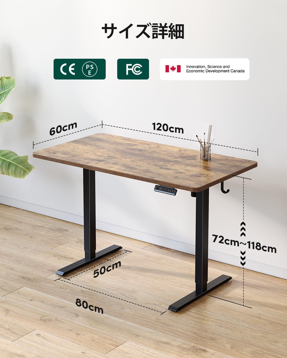 電動 昇降デスク 一枚板 FEZIBO 幅120 cm 奥行60 高さ72 118 スタンディングデスク 上下昇降 電動デスク 昇降式 ゲーミングデスク 4つメモリー機能 オフィスワーク スタンドpc机 ブラックフレーム ブラウン天板
