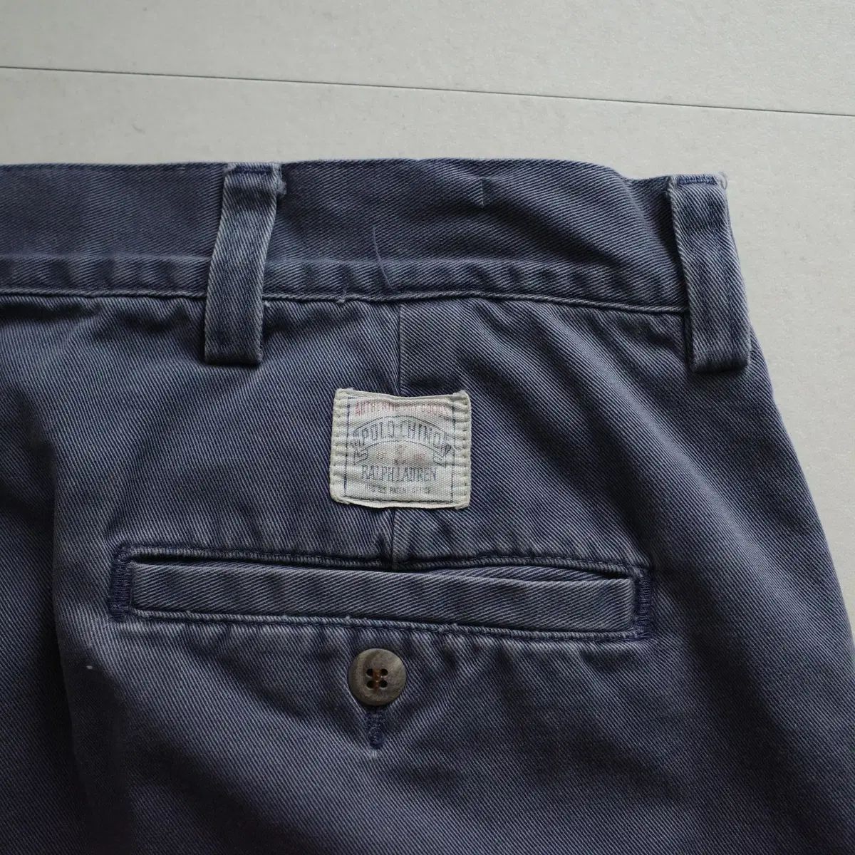 今では入手困難な90年代アメリカで生産されたPOLO RALPH LAUREN チノパンツです。しっかり素材のコットン生地と特有の自然なフェイディングが魅力の商品で、ヴィンテージな雰囲気を演出するのに適しています。ノータック(フラットフロント)デザインで、スタイリッシュなシルエットを見せます。