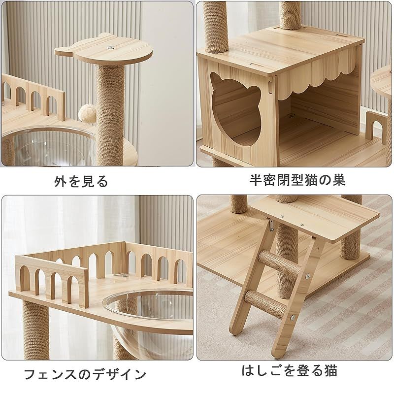 【猫ちゃんの遊び場】:室内用キャットタワーは、エンターテイメント、運動、休息が一体となった遊び場です。木製の展望台や隠れ家、360度の視野が透明な宇宙船など、リラックスできるスペースが備わっています。透明な宇宙船では、可愛い猫ちゃんが楽しそうに遊ぶ姿を眺めることができます。また、複数の高耐久性の爪とぎポールがあり、猫ちゃんは爪を研ぐこともできます。さらに、猫じゃらしを使えば、猫ちゃんは家の中でも楽しく過ごせます。