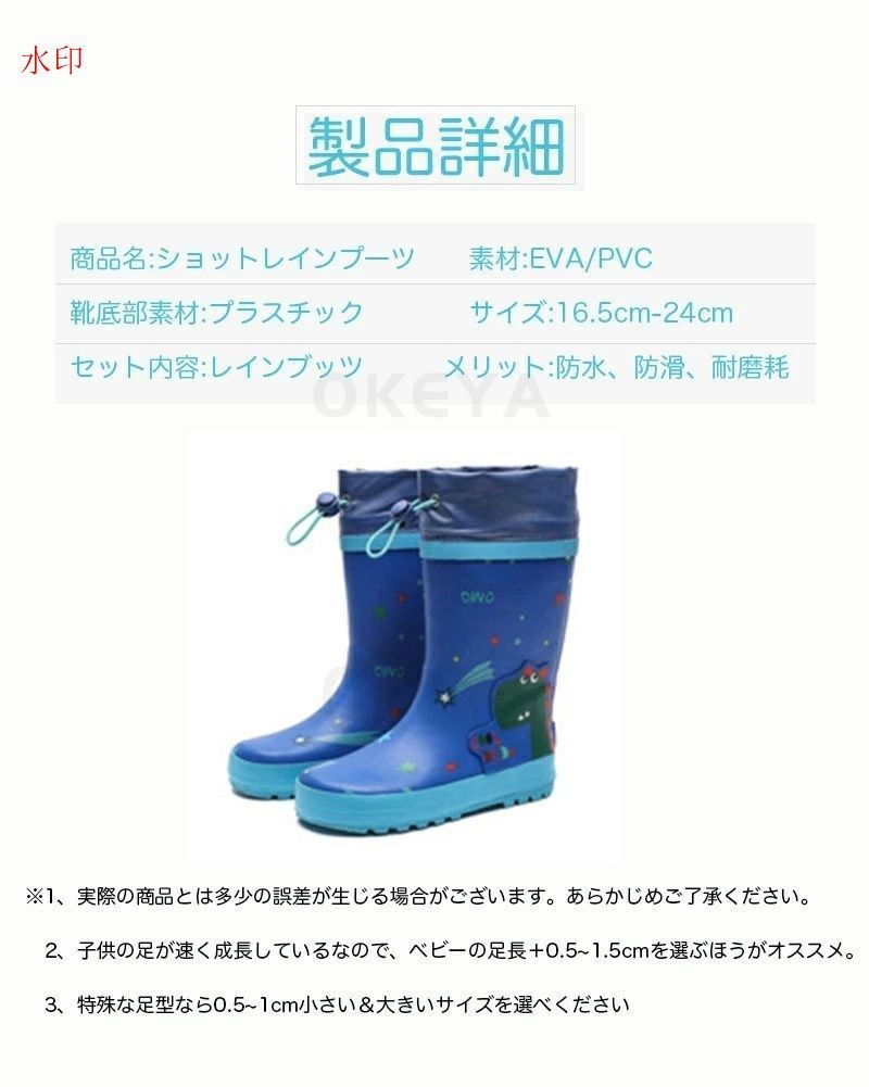 商品説明 このレインブーツは、子供たちの雨の日を楽しくするためにデザインされた商品です。軽量で幅広の設計により、快適な履き心地を提供します。絞り付きのデザインは、雨水の侵入を防ぎ、滑り止め機能が安全な歩行をサポートします。防水性に優れたこのミドル丈のレインシューズは、通園や通学、アウトドア活動に最適です。恐竜をモチーフにした可愛いデザインが特徴で、8つのカラーと12のサイズから選べるため、お子様の個性にぴったりの一足が見つかります。梅雨や台風の季節にも安心して使用できるこの商品は、実用性とデザイン性を兼ね備えた優れた選択肢です。