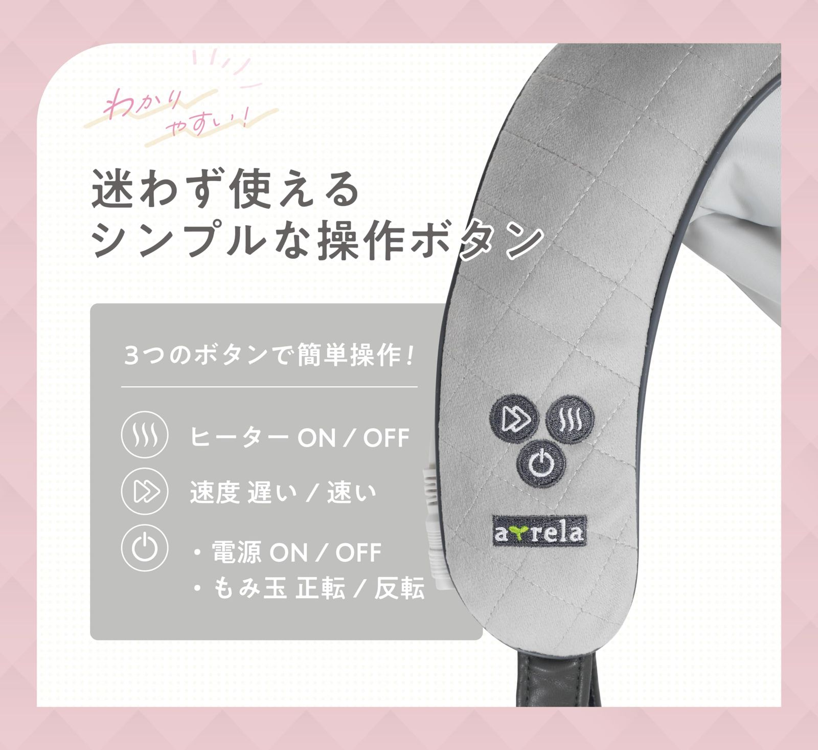 【場所を選ばないコードレスタイプ】コリの原因になりやすい首から肩周りを心地よく癒してくれるコードレスネックマッサージャー。充電式なので、デスクや移動先など様々な場所に持ち運んでいつでも気軽に疲れを癒せます。【コンパクト・超軽量】本体重量はシリーズ最軽量の1.2kgで、女性でもより扱いやすいサイズ感になりました。超軽量モデルながら、筋肉を深くほぐす充実のもみ心地、左右4つのもみ玉が回転しながら、首から肩周りを心地よくマッサージ。筋肉の奥深くまで入り込み、コリの元からほぐします。【「もみ上げ」「もみ下げ」マッサージ】もみ玉の回転モードの切替が可能。肩周りから上に押し流すようにほぐす「もみ上げマッサージ」と、首の付け根から挟みこみ首筋をつかみながらほぐす「もみ下げマッサージ」の2種類からお好みで選択できます。【人肌のようなぬくもりを再現】人肌程度に温まるあったかヒーターを搭載。じんわり温まりマッサージをアシストします。首だけでなく、太ももやふくらはぎにも使用できます。【商品仕様】◇本体サイズ:幅31×奥行55×高さ10cm
