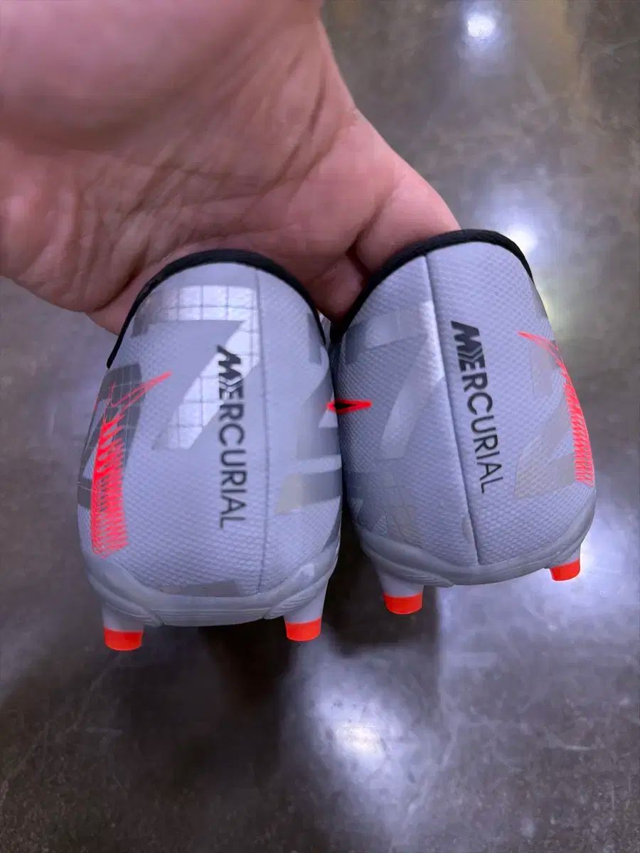 ナイキコリア タグ付き NIKE ジュニア マーキュリアル ヴェイパー 13 アカデミー FG/MG サッカーシューズです。ジュニア 240 サイズで、銀色 バターンに オレンジ POINT が入っています。