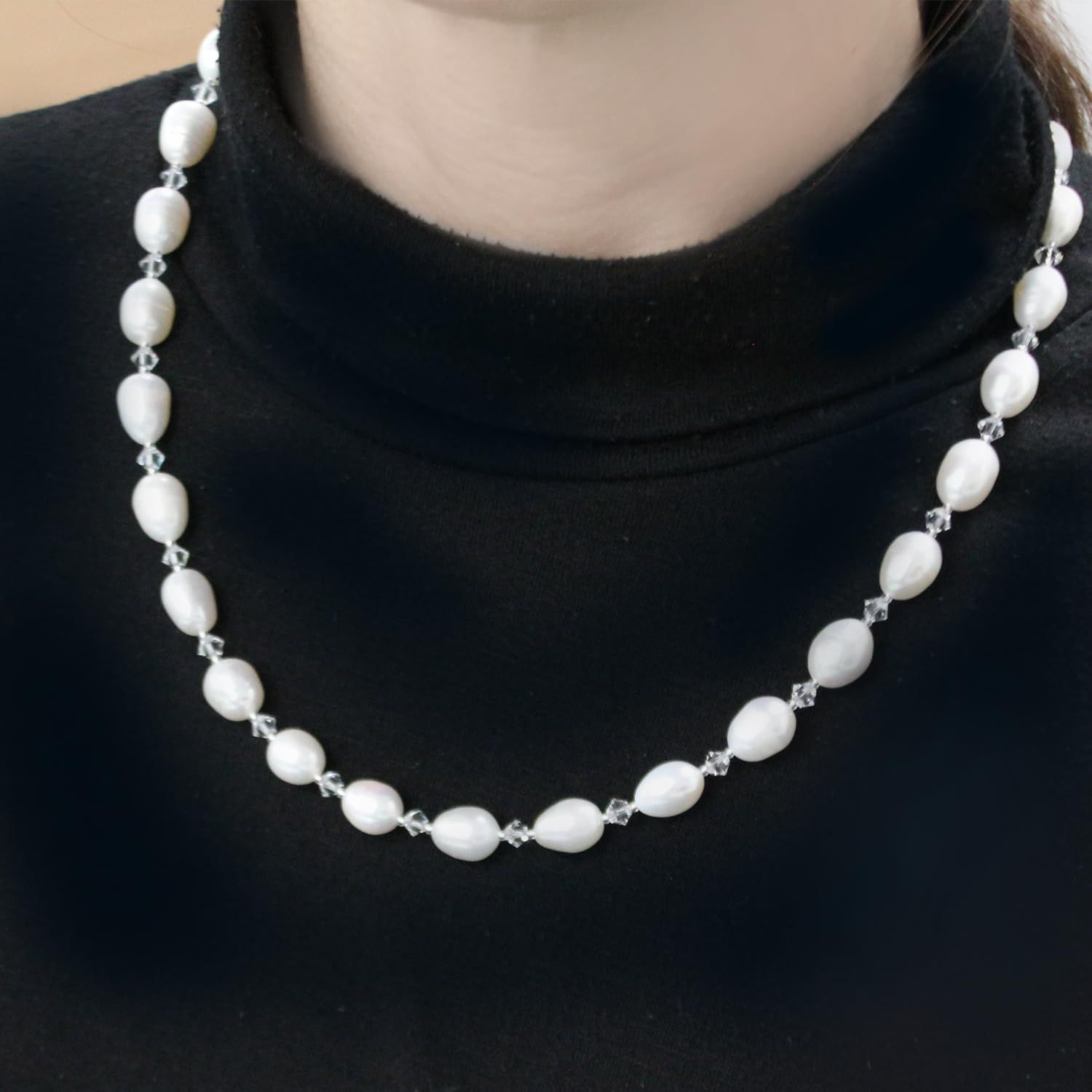 ふんわりと明るいグレーのオーバルパールの間にキラリと光るスワロフスキーが上品で華やかな印象のネックレスです。長さを自由に調節できるジョイント式なので、その時のファッションに合わせていろんなスタイルでお楽しみいただけます♪