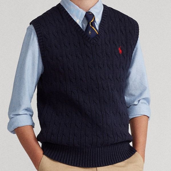 男の子用アイテム。ラルフローレン定番のケーブル編みニットのVネックベストです。胸にワンポイントのポニー刺繍のシンプルなデザインで、シャツやカットソーなど合わせるアイテムを選ばず着まわしの良い1枚です。特別な日のお出かけにもオススメ。