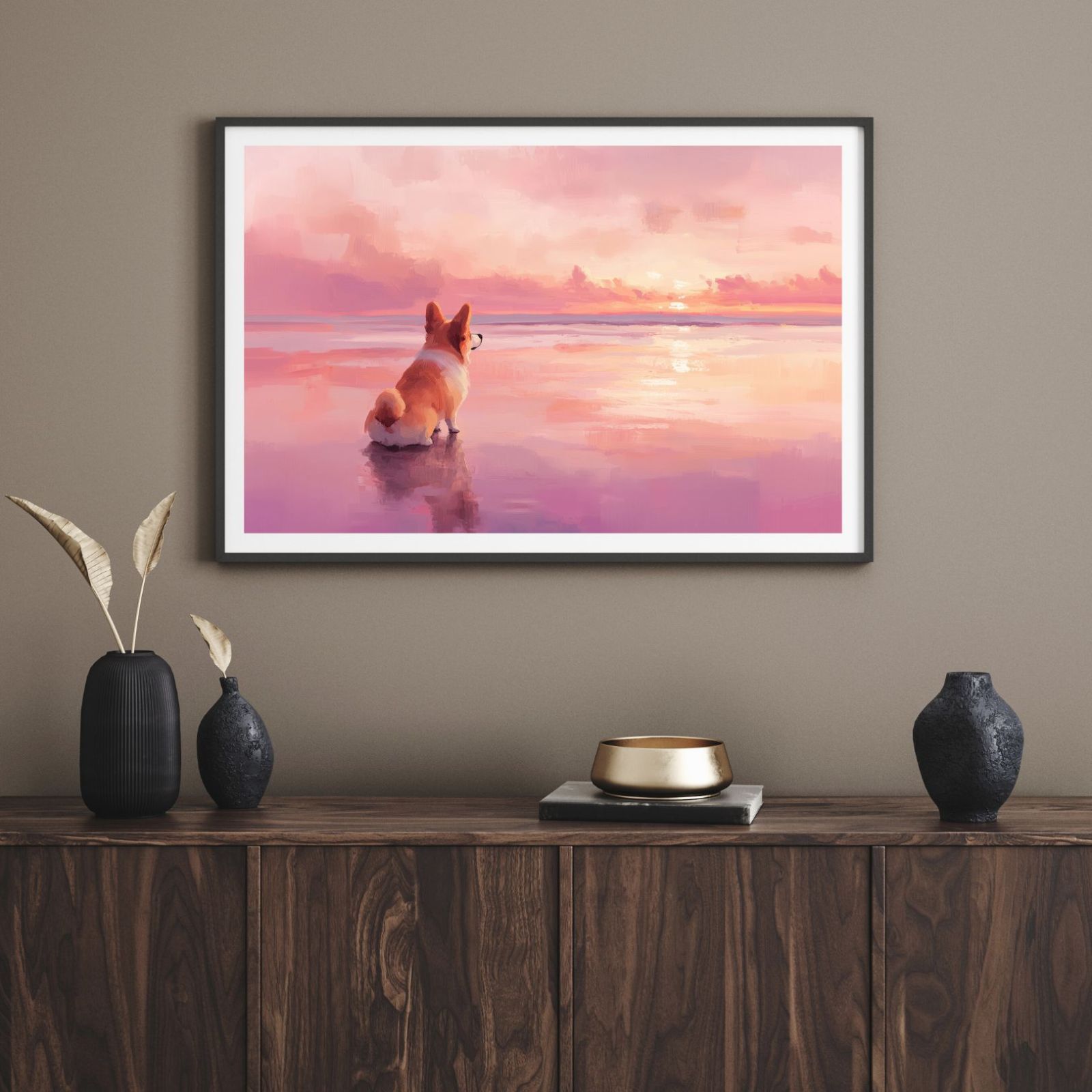 【サマーバケーション】は、サンセットビーチで(日の出・朝日・夕日・夕焼け)を眺める、ウェルシュコーギー犬の優しく心癒されるアートポスター作品です。