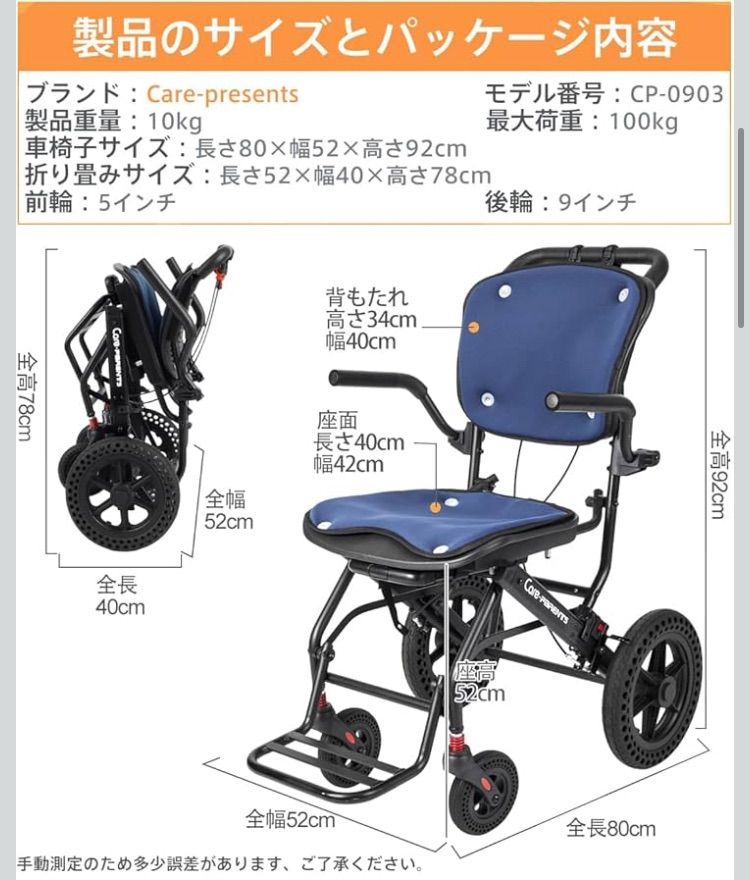 【製品情報】■車椅子サイズ:80CM×幅52CM×92CM ■折り畳みサイズ:52CM×40CM×78CM ■製品重量:10kg ■最大耐荷重:100kg ■前輪:5インチ ■後輪:9インチ (ノーパンクダイア空気入れが不要)