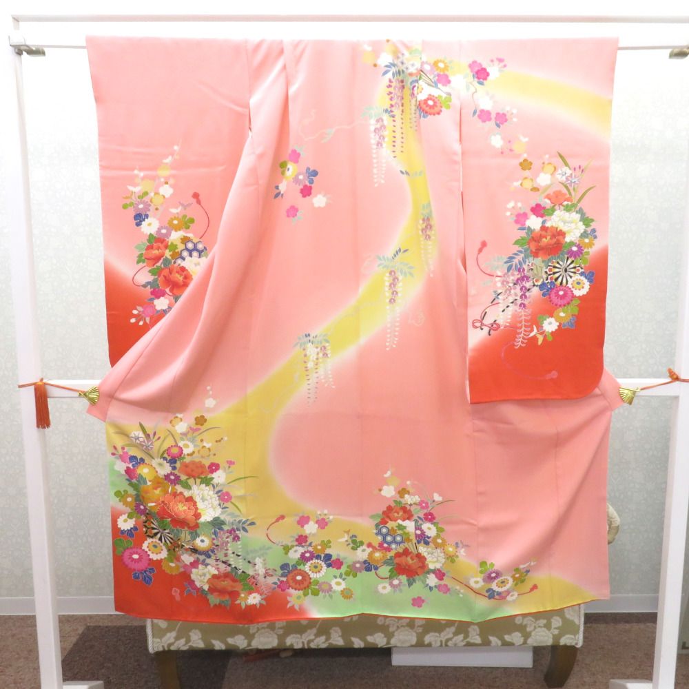 子供着物 女の子用 四つ身 襦袢セット ピンク×薄オレンジ×黄緑ぼかし 花車 一つ紋 ツタ紋 パールトーン加工 子供きもの 女児 七五三 祝着