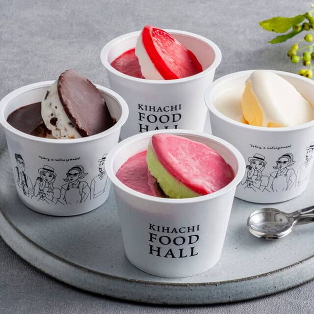 ■北海道の生クリームを使ったアイスとチョコやフルーツソースの相性を楽しめる2層仕立てのアイスクリーム。素材そのもののおいしさを引き出すKIHACHIならではのアイスギフトです。