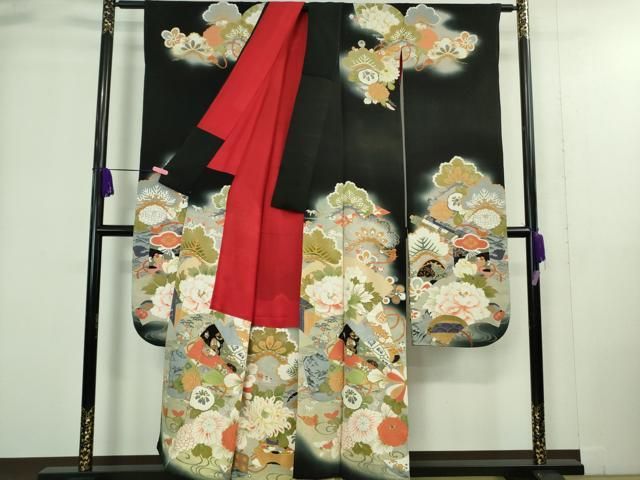 平和屋着物 上 アンティーク 大正ロマン 振袖 駒刺繍 吉祥鼓花文 暈し染め 黒地 金彩 kh 5