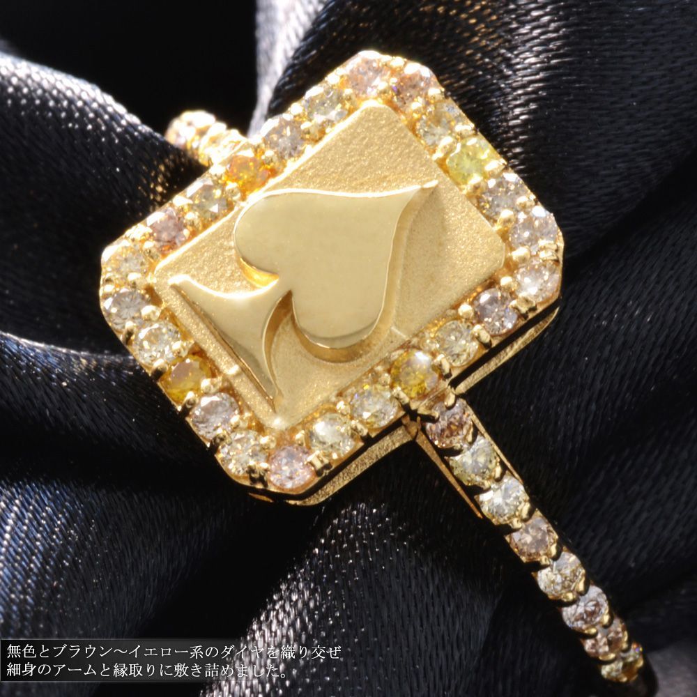 18金を使ったトランプモチーフのリングです。スペードモチーフのカードの淵とリングアームにダイヤモンドを敷き詰めました。無色とブラウン~イエロー系のダイヤを使い分けて配置し遊び心を感じるデザイン。男性はピンキーリングとしての使用がお勧め。女性もお召しになれます。