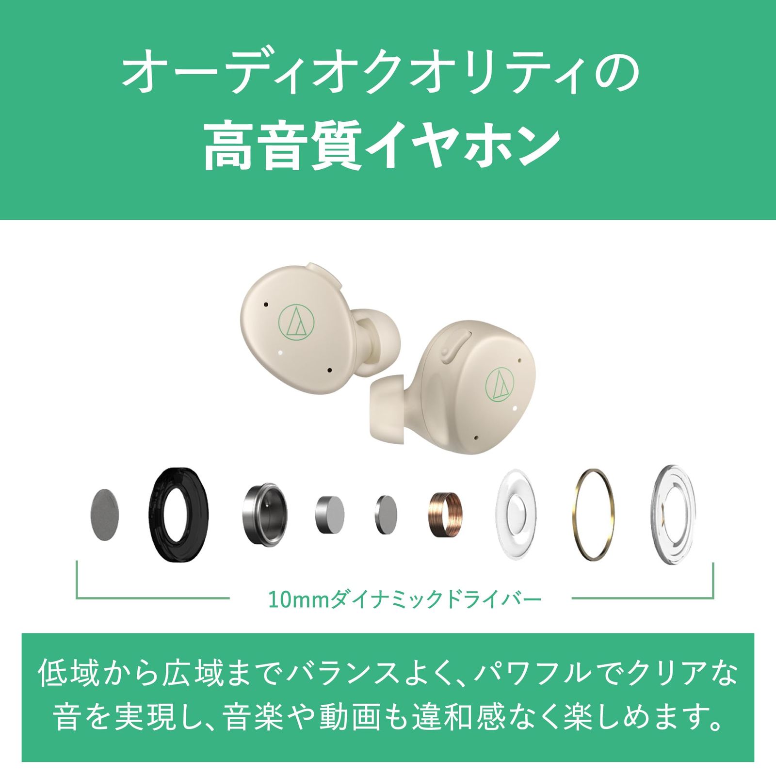 【耳にやさしい自然で快適なフィット感】 これまで培ってきた完全ワイヤレスイヤホンの設計ノウハウを注ぎ込み、より快適なフィット感を実現するためのデザインを追求。多数の耳型データでの装着検証に加え、より多くの方々の耳にフィットするよう軸長の違う2種類のイヤピースを同梱(イヤピース / イヤピースロング)