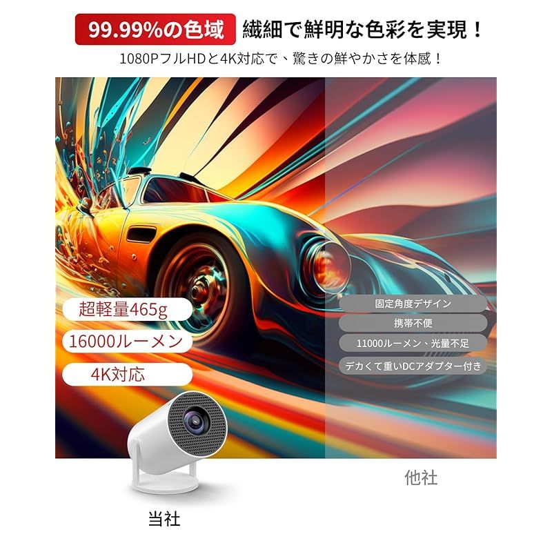 Billos プロジェクター 小型 270°回転 超軽量465 g 4 K対応 天井投影 家庭用 16000 LM高輝度 ホームプロジェクター 50%ズーム機能 5 GWIFI Bluetooth 5.3 スタンド一体型 内蔵HiFiスピーカー 0