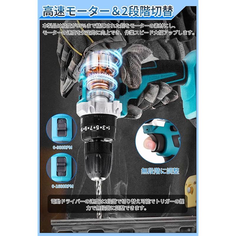 【強力な42N.m&25+3トルク調整&高速/低速切替&無段変速】?最大トルク42N・mと25段階のトルク調整機能を備え、ドリル、ドライバー、インパクトドライバーとして使用できます。電気ドリルの回転スピードは、980RPMと1680RPMの2段階で切り替えることができ、トリガーを握る力の強弱で無段階微調整が可能です。?スピード調節とトルク調節機能で、幅広い材質に傷をつけず、きれいな組み立てができます。この機能により、作業の多様性が大幅に向上します。木材、金属、プラスチックなど、さまざまな材料での作業が、これ一台で可能になります。高速設定では、大量の作業を迅速にこなすことができ、低速設定では、精密な作業に適しています。この電動ドリルは、あらゆるDIYプロジェクトに対応するための理想的なツールです。