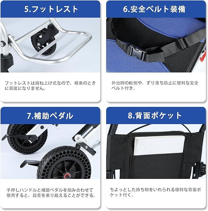 UGT 介助型車椅子 軽量 アルミ製 折りたたみ式 収納ポケット付き コンパクト 衝撃吸収 透気性 介護用品 介助ブレーキ付き 外出 旅行に適用 U-LY 002 ブルー