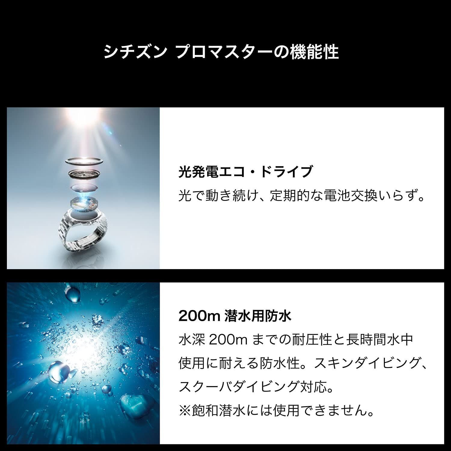 【Eco-Drive ダイバー 200m】シチズン独自の光発電技術「エコ・ドライブ」を搭載。水深200mまでの耐圧性と長時間水中に耐える防水性を備えています。