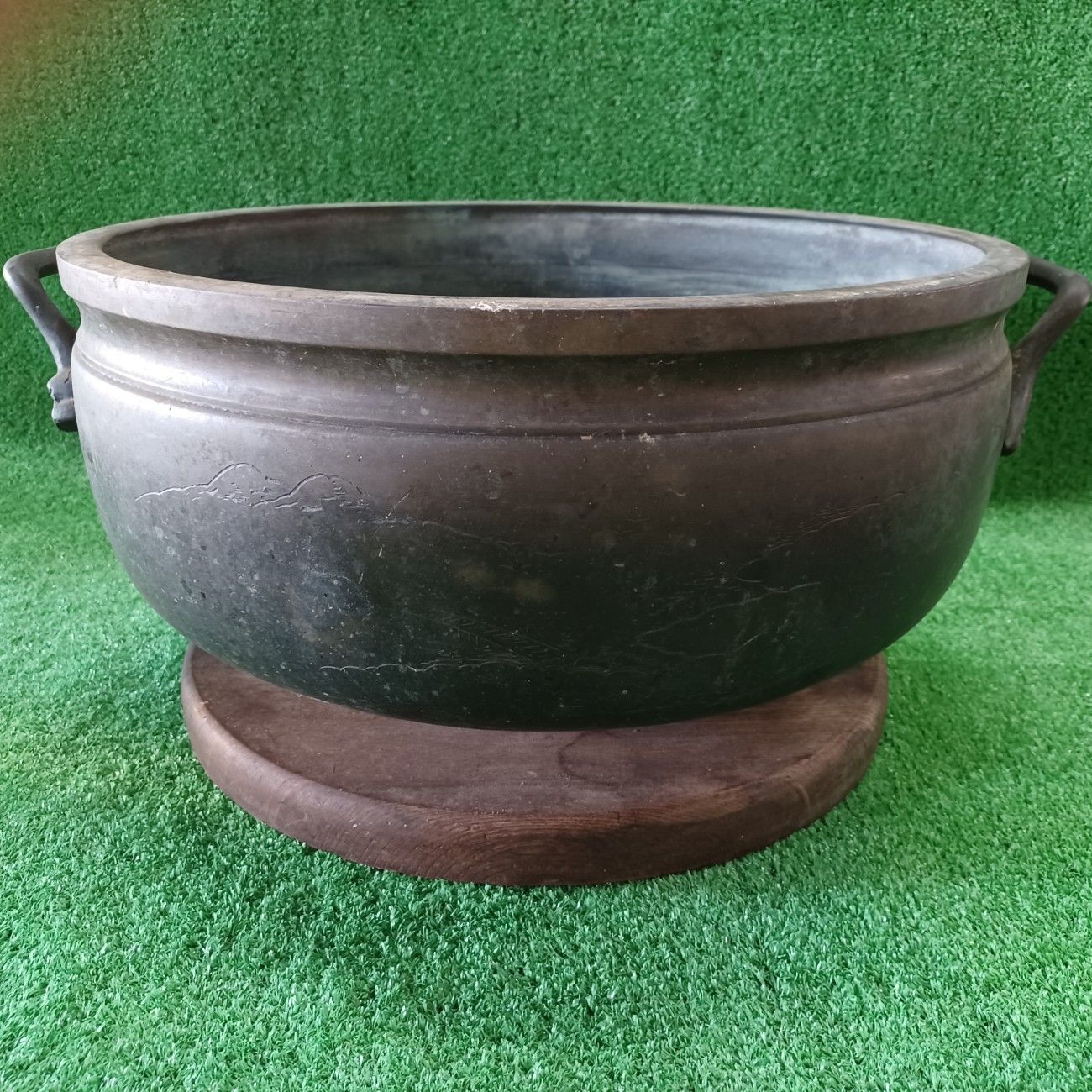 骨董 古美術 銅製 火鉢 彫金 山水図 双耳 三足 古民具 金属工芸